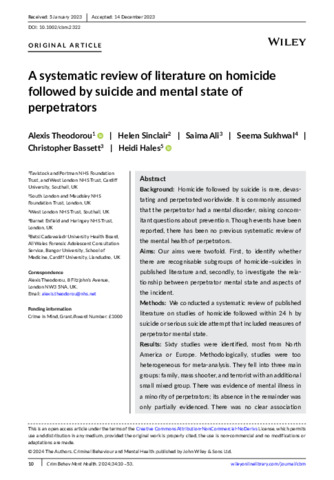 Theodorou, Alexis, Ali, Saima and Hales, Heidi (2024) A systematic review of literature on homicide followed by suicide and mental state of perpetrators. Criminal Behaviour and Mental Health, 34 (1). pp. 10-53. ISSN 0957-9664 Full text available