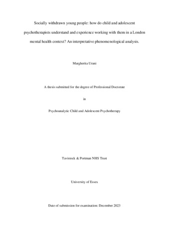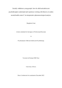Urani, Margherita (2024) Socially withdrawn young people: How do child and adolescent psychotherapists understand and experience working with them in a London mental health context? An interpretative phenomenological analysis. Professional Doctorate thesis, Tavistock and Portman NHS Foundation Trust/University of Essex. Full text available