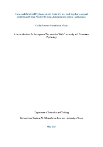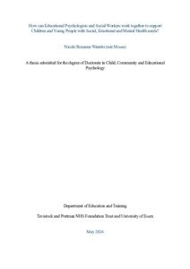 Wariebi, Nicole (2024) How can Educational Psychologists and Social Workers work together to support children and young People with Social, Emotional and Mental Health needs? Professional Doctorate thesis, Tavistock and Portman NHS Foundation Trust / University of Essex. Full text available