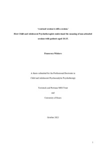 Wickers, Francesca (2023) ‘A missed session is still a session': How Child and Adolescent Psychotherapists understand the meaning of non-attended sessions with patients aged 18-25. Professional Doctorate thesis, Tavistock and Portman NHS Foundation Trust/University of Essex. Full text available
