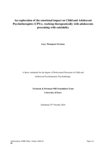 Thompson-Newman, Lucy (2025) An exploration of the emotional impact on Child and Adolescent Psychotherapists (CPTs), working therapeutically with adolescents presenting with suicidality. Professional Doctorate thesis, Tavistock and Portman NHS Foundation Trust / University of Essex. Full text available