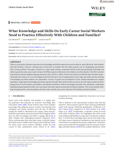 Child Family Social Work - 2025 - Bostock - What Knowledge and Skills Do Early Career Social Workers Need to Practice.pdf - Published Version Download (405kB) | Preview |