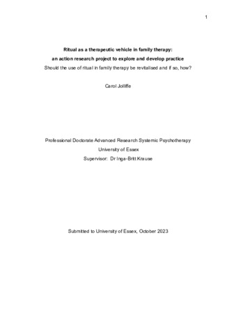 Jolliffe, Carol (2024) Ritual as a therapeutic vehicle in family therapy: an action research project to explore and develop practice. DSysPsych thesis, Tavistock and Portman NHS Foundation Trust. Full text available